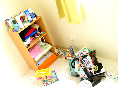 A very untidy corner of my tiny little room. It took me some trouble to think of the arrangement of the furniture. Oh, and that mustard sun-out curtain! How I wish there were other fab colours like, say, pink? There were only mustard and beige left. Both dull colour O.o
